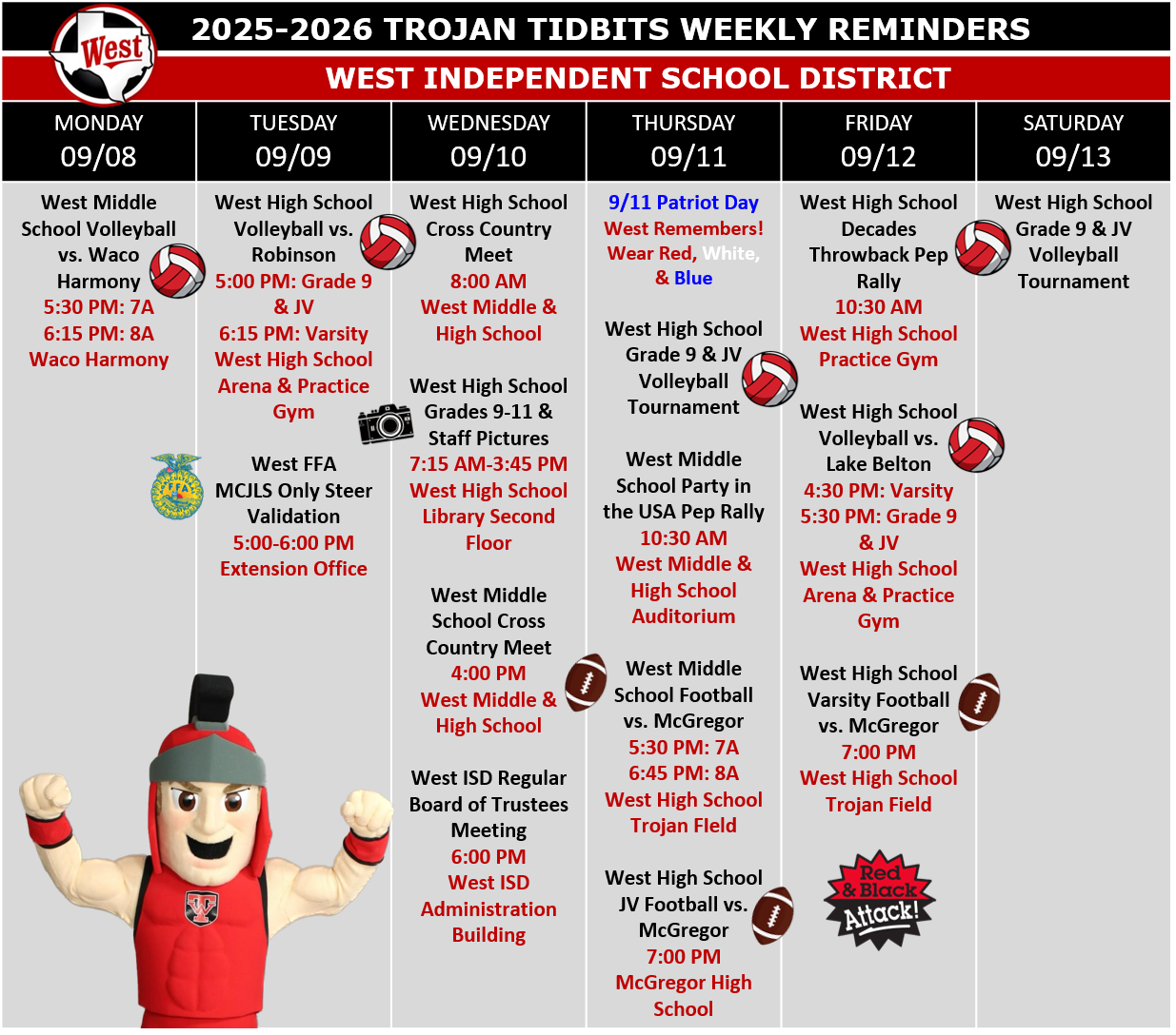 West High School Bonfire Reminder Tonight, Wednesday, November 5, 2025, the rescheduled Homecoming Bonfire is set to begin at 7:00 PM at the brush pile site behind the Trojan Field visitor bleachers. . .
